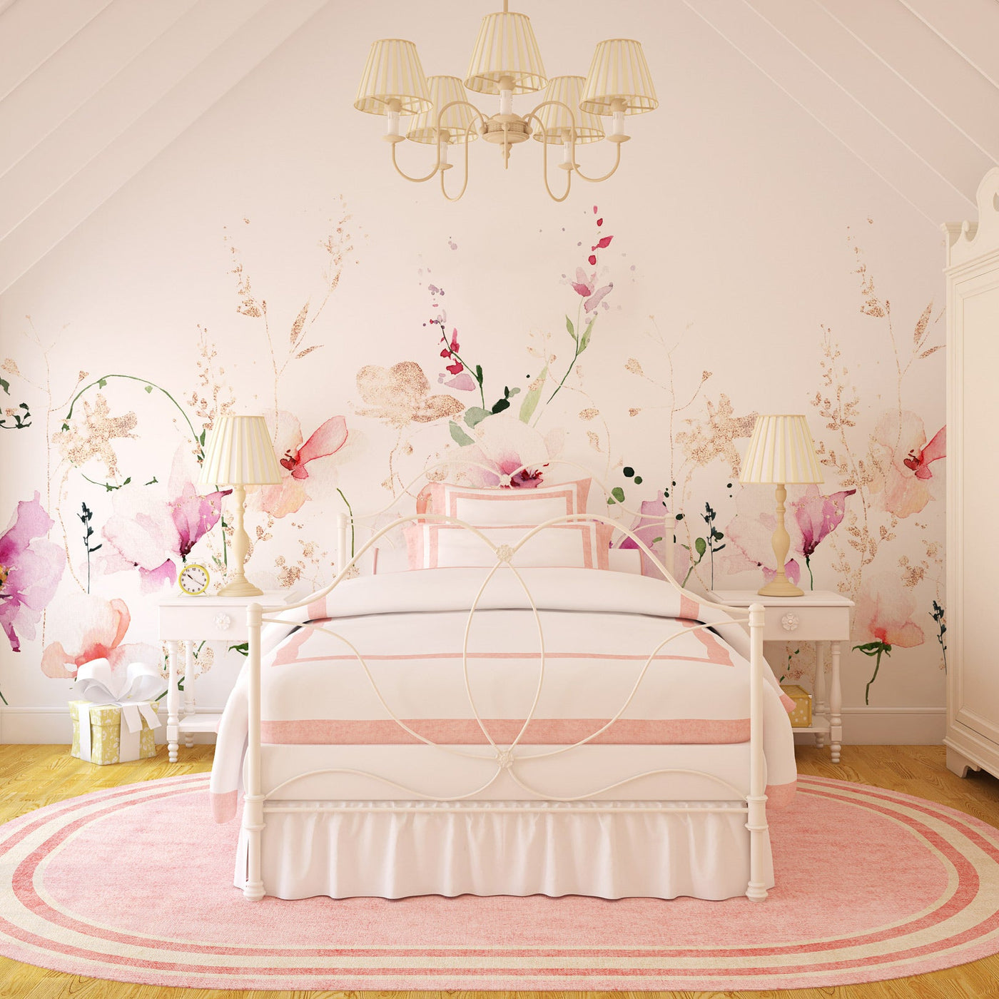 Ideale per camere da letto, salotti e ambienti dedicati al relax, questo murale unisce stile romantico e artigianalità con una stampa di alta qualità che valorizza ogni dettaglio. Le tonalità sofisticate si adattano a diverse palette d’arredo, creando un effetto scenografico elegante e avvolgente.