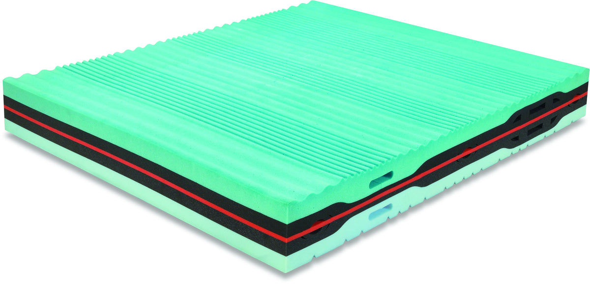 Foam 55 mm d.30 Kg/m3 (nero) + 15 mm d.35 Kg/m3 (Rosso) Parte centrale a riquadri varie densità + Water
